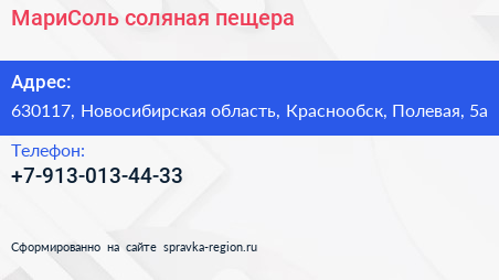 МариСоль, соляная пещера по адресу 630117, Новосибирская область, Краснообск, Полевая, 5а в дальнейшем Организация, размещена в следующих категориях:
