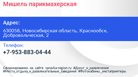 Мишель, парикмахерская по адресу 630058, Новосибирская область, Краснообск, Добровольческая, 2 в дальнейшем Организация, размещена в следующих категориях:
