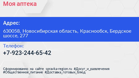 Моя аптека по адресу 630058, Новосибирская область, Краснообск, Бердское шоссе, 277 в дальнейшем Организация, размещена в следующих категориях: