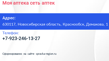 Моя аптека, сеть аптек по адресу 630117, Новосибирская область, Краснообск, Демакова, 1 в дальнейшем Организация, размещена в следующих категориях: