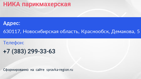 НИКА, парикмахерская по адресу 630117, Новосибирская область, Краснообск, Демакова, 5 в дальнейшем Организация, размещена в следующих категориях: