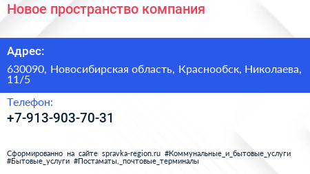 Новое пространство, компания по адресу 630090, Новосибирская область, Краснообск, Николаева, 11/5 в дальнейшем Организация, размещена в следующих категориях: