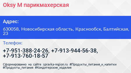 Oksy-M, парикмахерская по адресу 630058, Новосибирская область, Краснообск, Балтийская, 23 в дальнейшем Организация, размещена в следующих категориях: