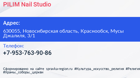 PILIM Nail Studio по адресу 630055, Новосибирская область, Краснообск, Мусы Джалиля, 3/1 в дальнейшем Организация, размещена в следующих категориях: