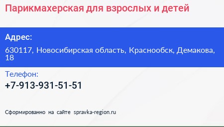 Парикмахерская для взрослых и детей по адресу 630117, Новосибирская область, Краснообск, Демакова, 18 в дальнейшем Организация, размещена в следующих категориях: