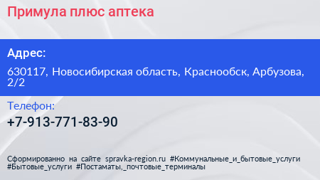 Примула плюс, аптека по адресу 630117, Новосибирская область, Краснообск, Арбузова, 2/2 в дальнейшем Организация, размещена в следующих категориях: