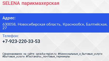 SELENA, парикмахерская по адресу 630058, Новосибирская область, Краснообск, Балтийская, 27 в дальнейшем Организация, размещена в следующих категориях: