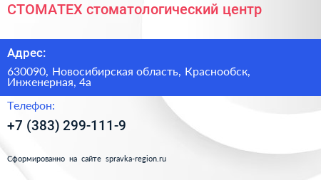 СТОМАТЕХ, стоматологический центр по адресу 630090, Новосибирская область, Краснообск, Инженерная, 4а в дальнейшем Организация, размещена в следующих категориях: