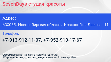 SevenDays, студия красоты по адресу 630055, Новосибирская область, Краснообск, Лыкова, 11 в дальнейшем Организация, размещена в следующих категориях: