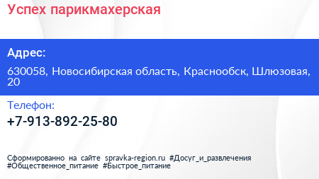 Успех, парикмахерская по адресу 630058, Новосибирская область, Краснообск, Шлюзовая, 20 в дальнейшем Организация, размещена в следующих категориях: