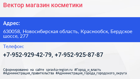 Вектор, магазин косметики по адресу 630058, Новосибирская область, Краснообск, Бердское шоссе, 277 в дальнейшем Организация, размещена в следующих категориях: