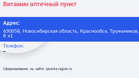 Витамин, аптечный пункт по адресу 630058, Новосибирская область, Краснообск, Тружеников, 8 к1 в дальнейшем Организация, размещена в следующих категориях: