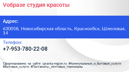 Vобразе, студия красоты по адресу 630058, Новосибирская область, Краснообск, Шлюзовая, 14 в дальнейшем Организация, размещена в следующих категориях: