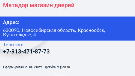 Матадор, магазин дверей по адресу 630090, Новосибирская область, Краснообск, Кутателадзе, 4 в дальнейшем Организация, размещена в следующих категориях:
