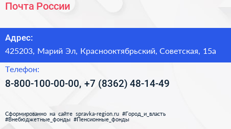 Почта России по адресу 425203, Марий Эл, Краснооктябрьский, Советская, 15а в дальнейшем Организация, размещена в следующих категориях: