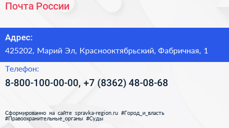 Почта России по адресу 425202, Марий Эл, Краснооктябрьский, Фабричная, 1 в дальнейшем Организация, размещена в следующих категориях: