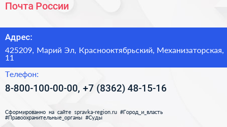 Почта России по адресу 425209, Марий Эл, Краснооктябрьский, Механизаторская, 11 в дальнейшем Организация, размещена в следующих категориях: