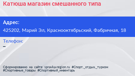 Катюша, магазин смешанного типа по адресу 425202, Марий Эл, Краснооктябрьский, Фабричная, 18 в дальнейшем Организация, размещена в следующих категориях: