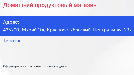 Домашний, продуктовый магазин по адресу 425200, Марий Эл, Краснооктябрьский, Центральная, 23а в дальнейшем Организация, размещена в следующих категориях: