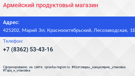 Армейский, продуктовый магазин по адресу 425202, Марий Эл, Краснооктябрьский, Лесозаводская, 1Б в дальнейшем Организация, размещена в следующих категориях:
