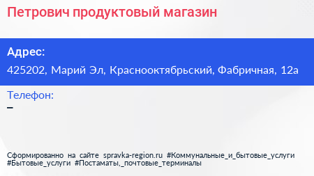 Петрович, продуктовый магазин по адресу 425202, Марий Эл, Краснооктябрьский, Фабричная, 12а в дальнейшем Организация, размещена в следующих категориях: