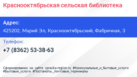 Краснооктябрьская сельская библиотека по адресу 425202, Марий Эл, Краснооктябрьский, Фабричная, 3 в дальнейшем Организация, размещена в следующих категориях: