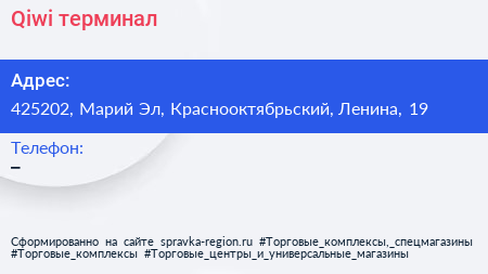 Qiwi, терминал по адресу 425202, Марий Эл, Краснооктябрьский, Ленина, 19 в дальнейшем Организация, размещена в следующих категориях: