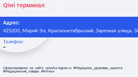 Qiwi, терминал по адресу 425203, Марий Эл, Краснооктябрьский, Заречная улица, 36 в дальнейшем Организация, размещена в следующих категориях: