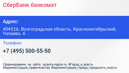 СберБанк, банкомат по адресу 404116, Волгоградская область, Краснооктябрьский, Чапаева, 6 в дальнейшем Организация, размещена в следующих категориях: