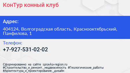 КонТур, конный клуб по адресу 404124, Волгоградская область, Краснооктябрьский, Панфилова, 1 в дальнейшем Организация, размещена в следующих категориях: