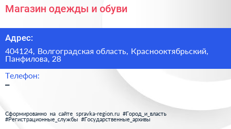 Магазин одежды и обуви по адресу 404124, Волгоградская область, Краснооктябрьский, Панфилова, 28 в дальнейшем Организация, размещена в следующих категориях: