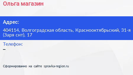 Ольга, магазин по адресу 404114, Волгоградская область, Краснооктябрьский, 31-я (Заря снт), 17 в дальнейшем Организация, размещена в следующих категориях: