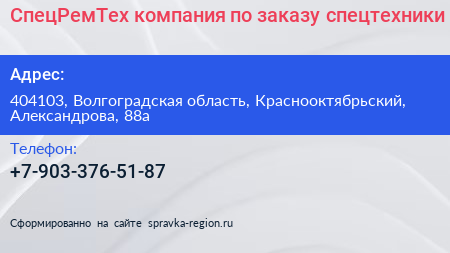 СпецРемТех, компания по заказу спецтехники по адресу 404103, Волгоградская область, Краснооктябрьский, Александрова, 88а в дальнейшем Организация, размещена в следующих категориях:
