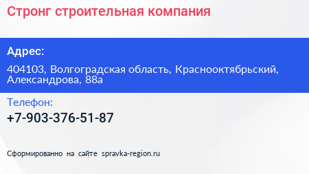 Стронг, строительная компания по адресу 404103, Волгоградская область, Краснооктябрьский, Александрова, 88а в дальнейшем Организация, размещена в следующих категориях: