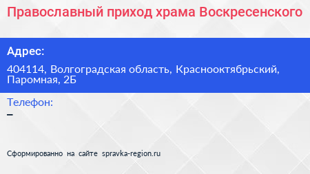 Православный приход храма Воскресенского по адресу 404114, Волгоградская область, Краснооктябрьский, Паромная, 2Б в дальнейшем Организация, размещена в следующих категориях: