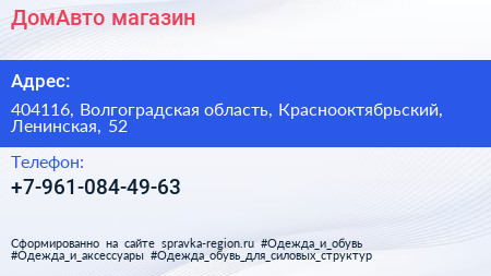 ДомАвто, магазин по адресу 404116, Волгоградская область, Краснооктябрьский, Ленинская, 52 в дальнейшем Организация, размещена в следующих категориях: