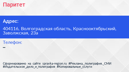 Паритет по адресу 404116, Волгоградская область, Краснооктябрьский, Заволжская, 23а в дальнейшем Организация, размещена в следующих категориях: