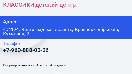 КЛАССИКИ, детский центр по адресу 404124, Волгоградская область, Краснооктябрьский, Калинина, 2 в дальнейшем Организация, размещена в следующих категориях: