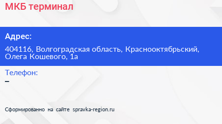 МКБ, терминал по адресу 404116, Волгоградская область, Краснооктябрьский, Олега Кошевого, 1а в дальнейшем Организация, размещена в следующих категориях: