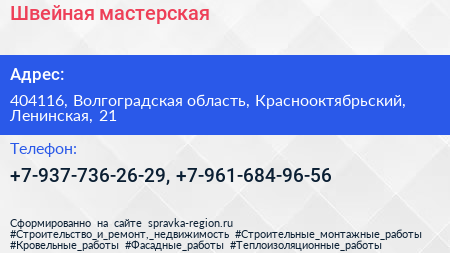 Швейная мастерская по адресу 404116, Волгоградская область, Краснооктябрьский, Ленинская, 21 в дальнейшем Организация, размещена в следующих категориях: