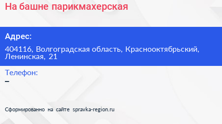 На башне, парикмахерская по адресу 404116, Волгоградская область, Краснооктябрьский, Ленинская, 21 в дальнейшем Организация, размещена в следующих категориях: