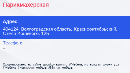 Парикмахерская по адресу 404124, Волгоградская область, Краснооктябрьский, Олега Кошевого, 12Б в дальнейшем Организация, размещена в следующих категориях: