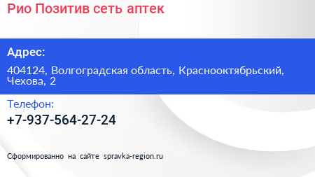 Рио-Позитив, сеть аптек по адресу 404124, Волгоградская область, Краснооктябрьский, Чехова, 2 в дальнейшем Организация, размещена в следующих категориях: