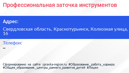 Профессиональная заточка инструментов по адресу Свердловская область, Краснотурьинск, Колхозная улица, 16 в дальнейшем Организация, размещена в следующих категориях: