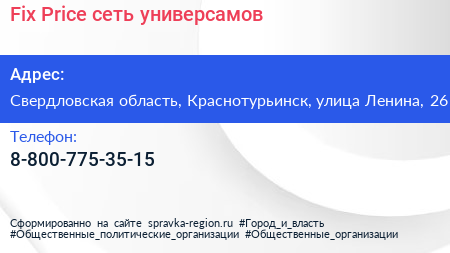 Fix Price, сеть универсамов по адресу Свердловская область, Краснотурьинск, улица Ленина, 26 в дальнейшем Организация, размещена в следующих категориях: