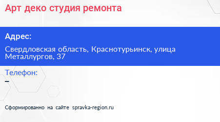 Арт-деко, студия ремонта по адресу Свердловская область, Краснотурьинск, улица Металлургов, 37 в дальнейшем Организация, размещена в следующих категориях: