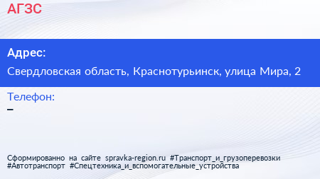 АГЗС по адресу Свердловская область, Краснотурьинск, улица Мира, 2 в дальнейшем Организация, размещена в следующих категориях: