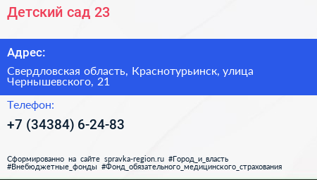 Детский сад №23 по адресу Свердловская область, Краснотурьинск, улица Чернышевского, 21 в дальнейшем Организация, размещена в следующих категориях: