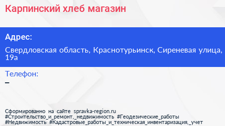 Карпинский хлеб, магазин по адресу Свердловская область, Краснотурьинск, Сиреневая улица, 19а в дальнейшем Организация, размещена в следующих категориях: