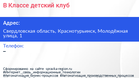 В Классе, детский клуб по адресу Свердловская область, Краснотурьинск, Молодёжная улица, 1 в дальнейшем Организация, размещена в следующих категориях: